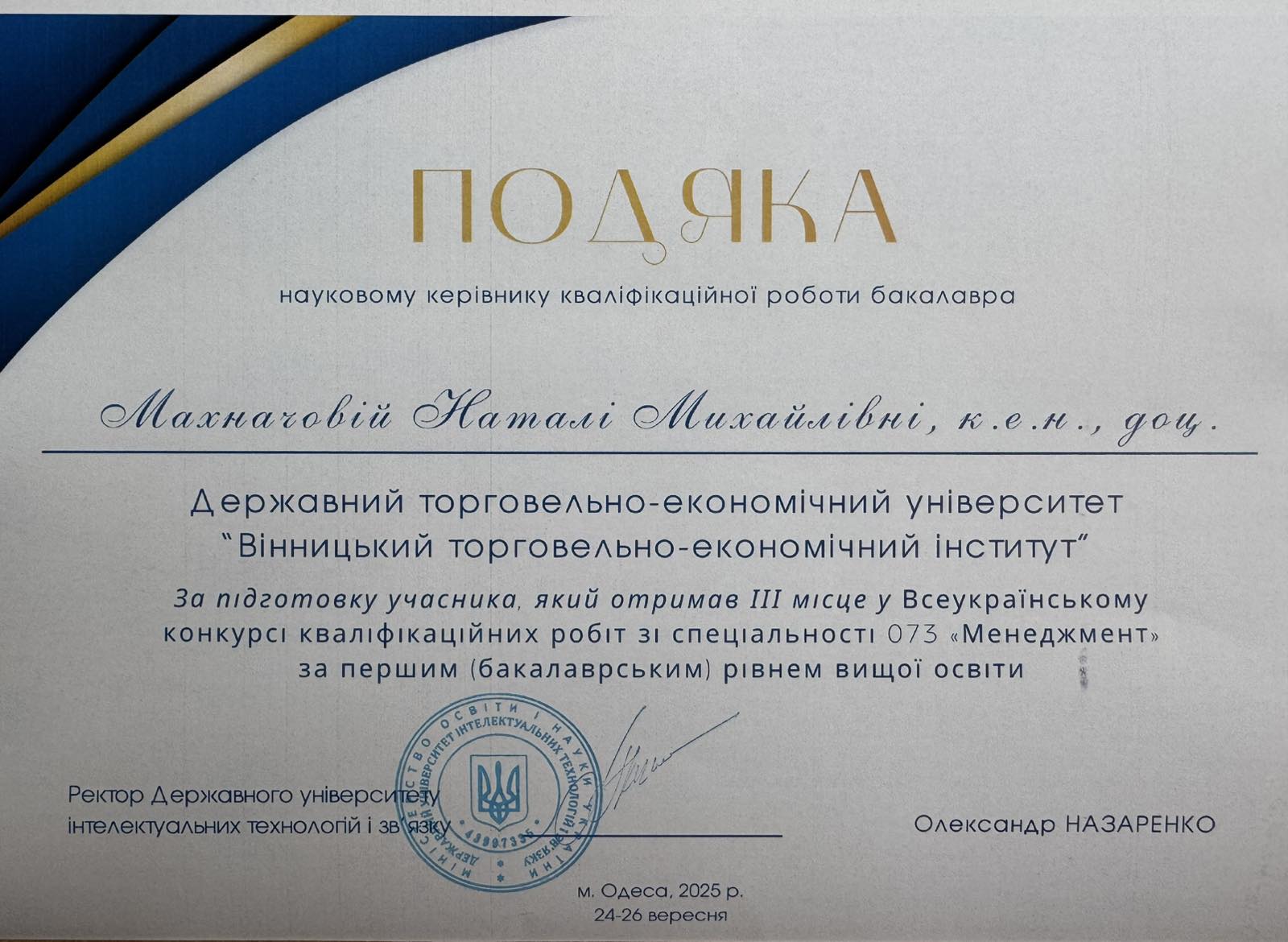 Перемога у Всеукраїнському конкурсі кваліфікаційних робіт зі спеціальності 073 «Менеджмент» за першим (бакалаврським) рівнем вищої освіти
