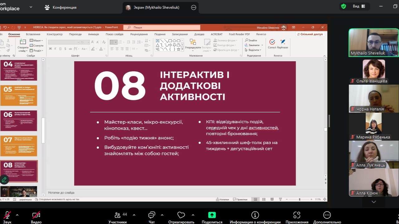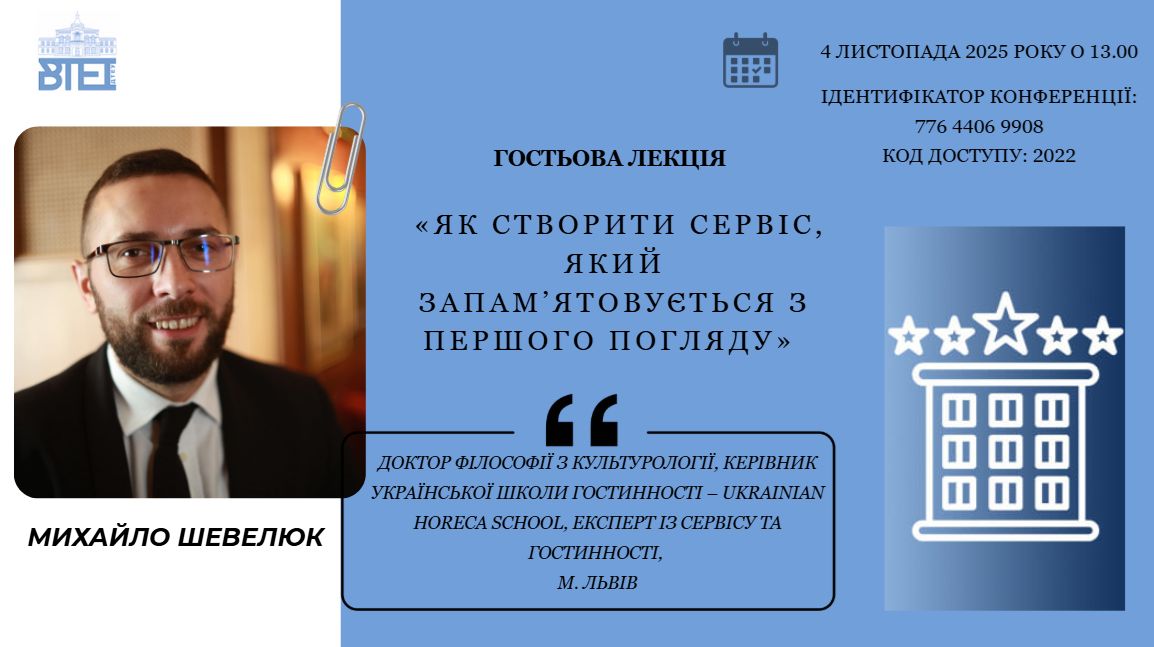 04 листопада 2025 року в інституті відбулася гостьова лекція на тему «Як створити сервіс, який запам’ятовується з першого погляду», яку на запрошення кафедри туризму та готельно-ресторанної справи для здобувачів вищої освіти за спеціальностями J2 Готельно-ресторанна справа та кейтеринг, J3 Туризм та рекреація, G13 Харчові технології провів Михайло Шевелюк – засновник та керівник Школи гостинності Ukrainian Horeca School, експерт з сервісу та гостинності, менеджер з розвитку готелю «Швейцарський» та ресторану «Валентино» (м. Львів), доктор філософії з культурології, викладач кафедри готельно-ресторанного бізнесу Львівського державного університету фізичної культури імені Івана Боберського.