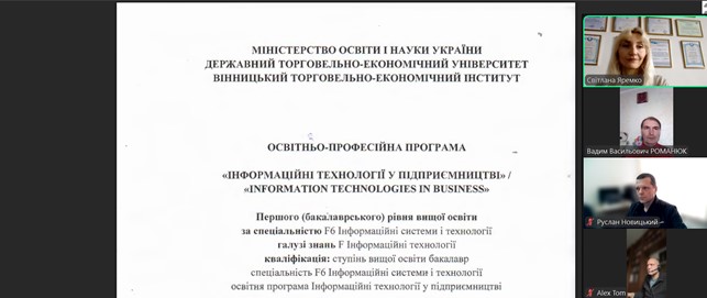 В ході проведення засідання робочої групи до відома зовнішніх стейкголдерів було донесено інформацію щодо реструктуризації підрозділів Вінницького торговельно-економічного інституту ДТЕУ та утворення кафедри інноваційної економіки та цифрових технологій, на базі якої буде здійснюватись підготовка здобувачів за освітньою програмою «Інформаційні технології у підприємництві». Також обговорювались питання щодо оновлення освітніх компонент відповідно до потреб сучасного конкурентного середовища.