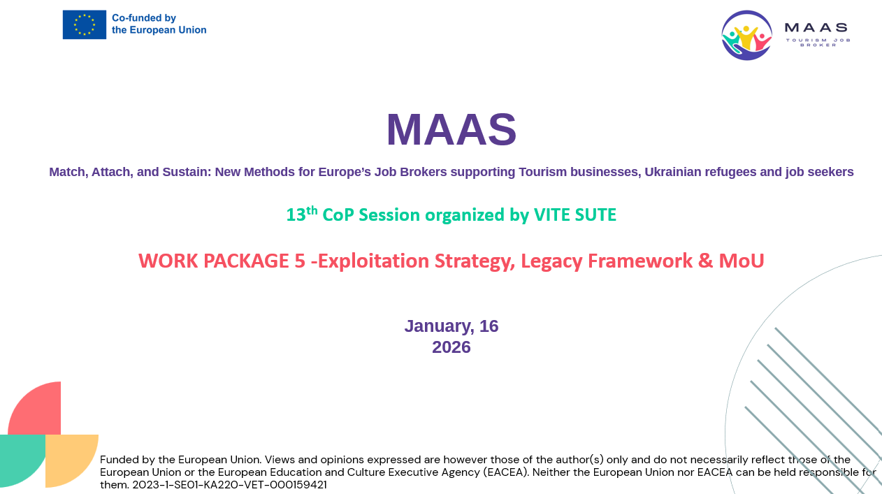 У рамках реалізації ВТЕІ ДТЕУ міжнародного проєкту ERASMUS+ MAAS “Match, Attach and Sustain: New methods for Europe`s Job Brokers” 16 січня 2026 року відбулася 13-та транснаціональна онлайн-зустріч партнерів, яка була організована та проведена командою ВТЕІ ДТЕУ.