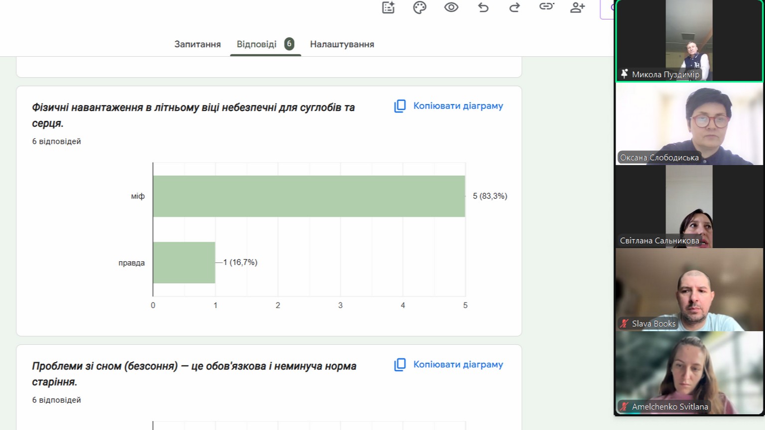 Заняття проходило у дистанційному форматі, що не завадило створити атмосферу живої взаємодії. Використовуючи сучасні цифрові інструменти, магістри в реальному часі пройшли опитування «Руйнівники міфів». Студенти аналізували поширені стереотипи про старіння: від когнітивних можливостей мозку до реальних перспектив фізичної активності після 60 років.