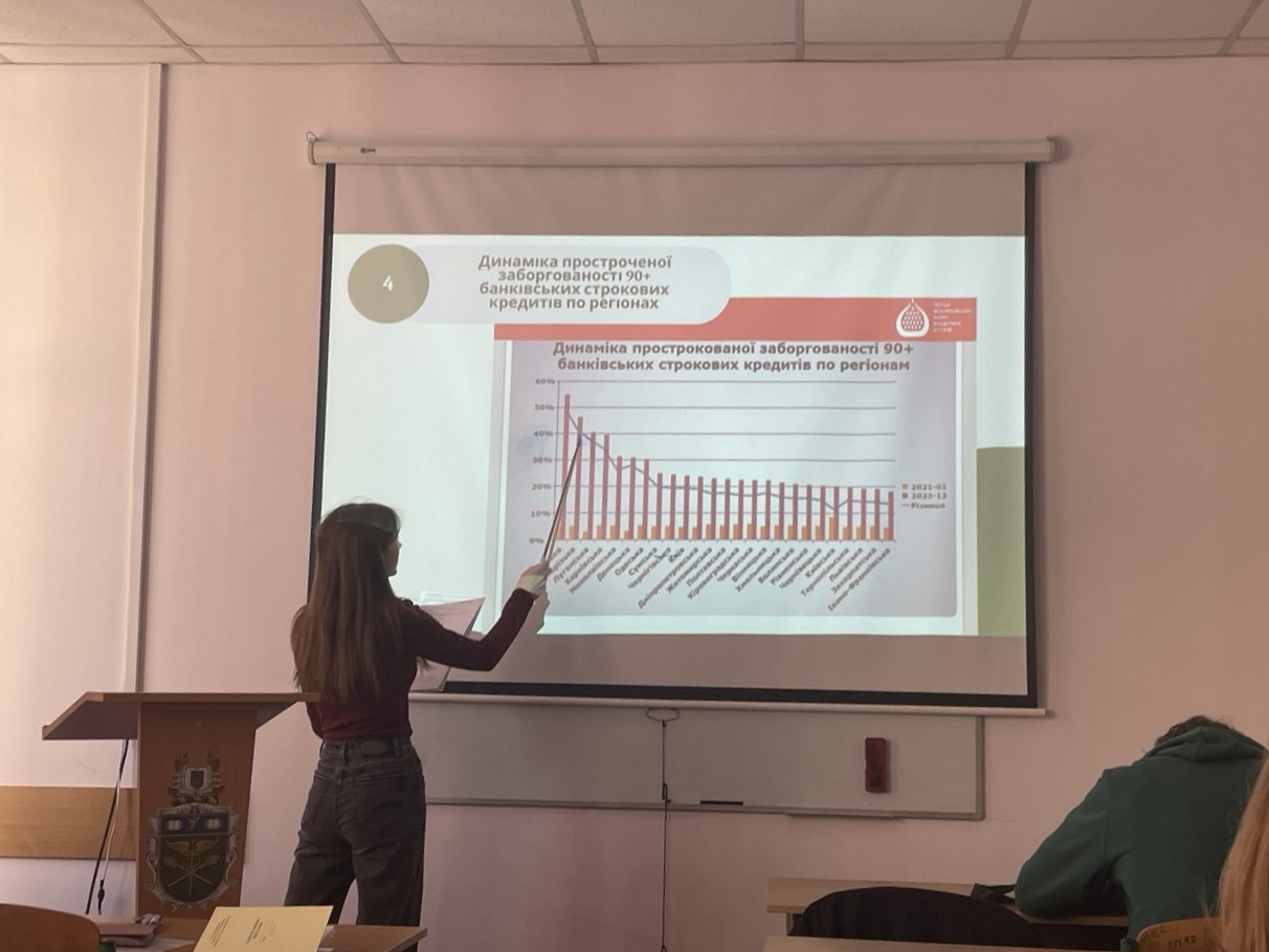 Савчук Даша виступила з доповіддю на тему «Кредитування в Україні: виклики воєнного стану та трансформація ризиків». Особливості депозитної політики банків в умовах війни в Україні висвітлила в своєму виступі Волощук Анна, наголосивши, що завдяки виваженому регулюванню з боку НБУ обсяги залучених на банківські депозити ресурсів зросли, не зважаючи на загрози воєнного стану. Горофянюк Ірина розкрила механізм врегулювання проблемних банківських кредитів. Допомога міжнародних фінансових організацій Україні через банківську систему була висвітлена у доповіді Забуранної Анни. Найбільш гострі проблеми кредитування економіки України в своїй презентації розкрила Григоренко Єлизавета. Іщук Анастасія виступила з доповіддю на тему «Споживче кредитування в Україні: сучасний стан та перспективи» , в якій розкрила динаміку, структуру споживчого кредитування в сучасних умовах і окреслила головні проблеми у забезпеченні своєчасного повернення кредитів. Велику зацікавленість викликала доповідь Кіпоренко Маріі на тему «Фонд гарантування вкладів фізичних осіб та його роль у захисті вкладників», в якій переконливо довела значення діяльності цього фонду, зокрема гарантування повернення 100% вкладів протягом дії воєнного стану і ще 3-х місяців після його скасування.