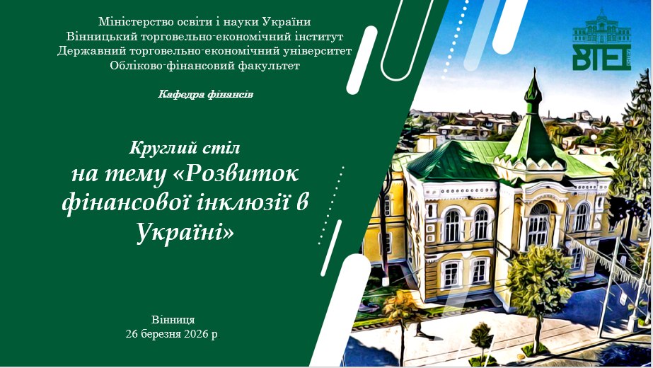 26 березня 2026 року у Вінницькому торговельно-економічному інституті ДТЕУ в рамках святкування тижня обліково-фінансового факультету відбувся круглий стіл на тему «Розвиток фінансової інклюзії в Україні», який об’єднав здобувачів бакалаврату та магістратури освітньої програми «Фінанси, банківська справа, страхування та фондовий ринок», а також здобувачів фахового молодшого бакалавра освітньої програми «Бізнес-технології та рекламна діяльність» Вінницького фахового коледжу будівництва, архітектури та дизайну КНУБА.