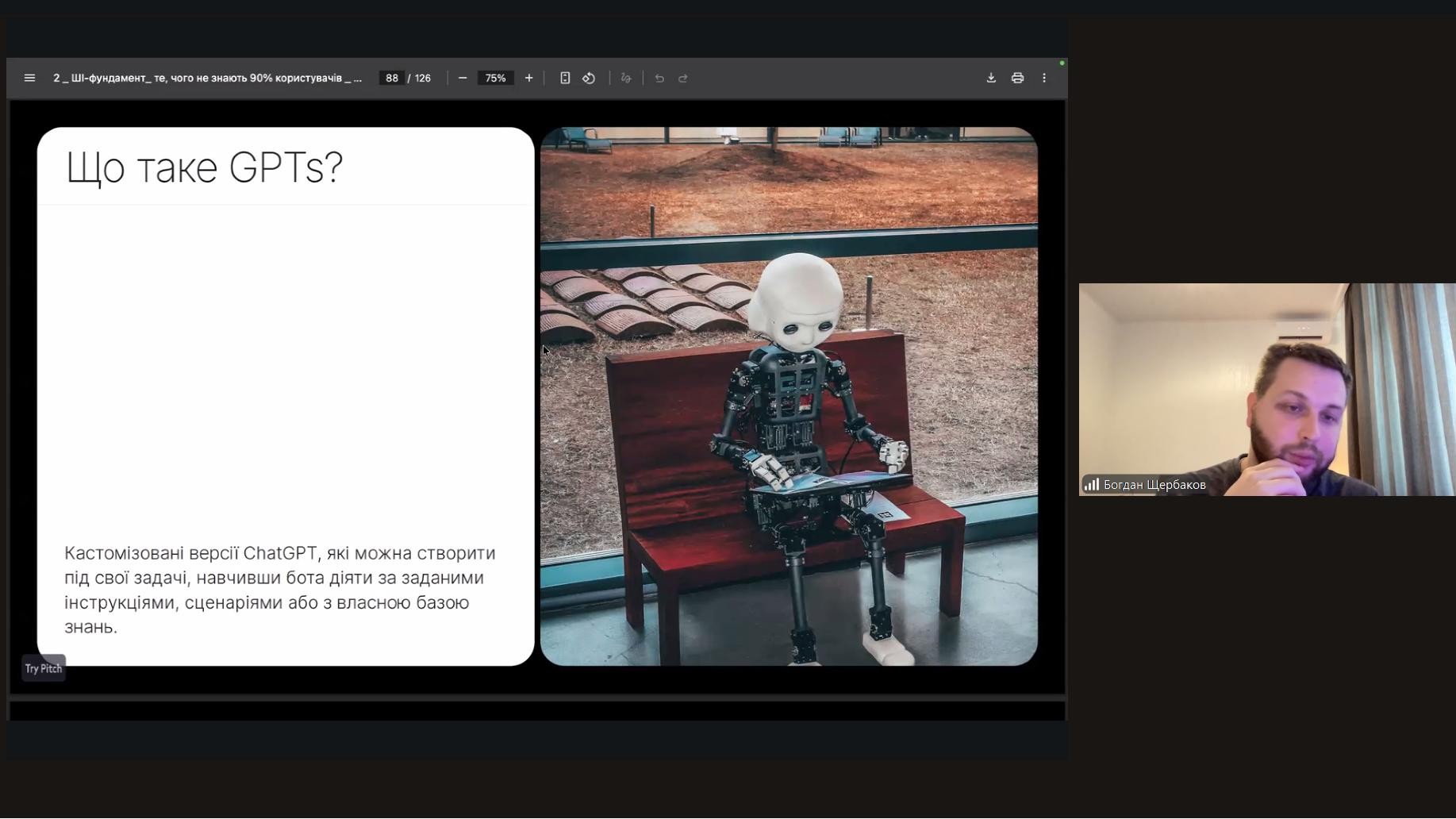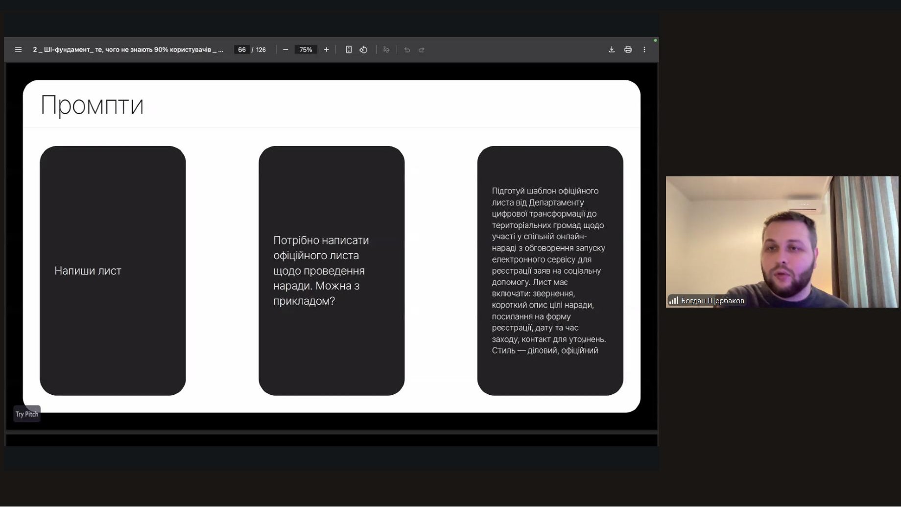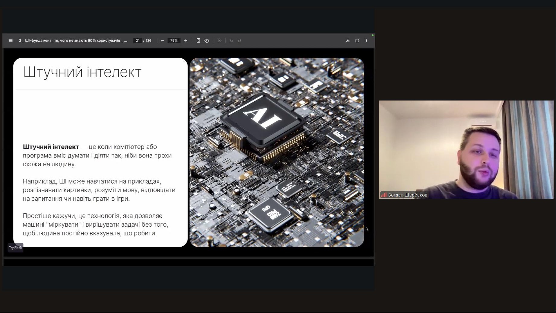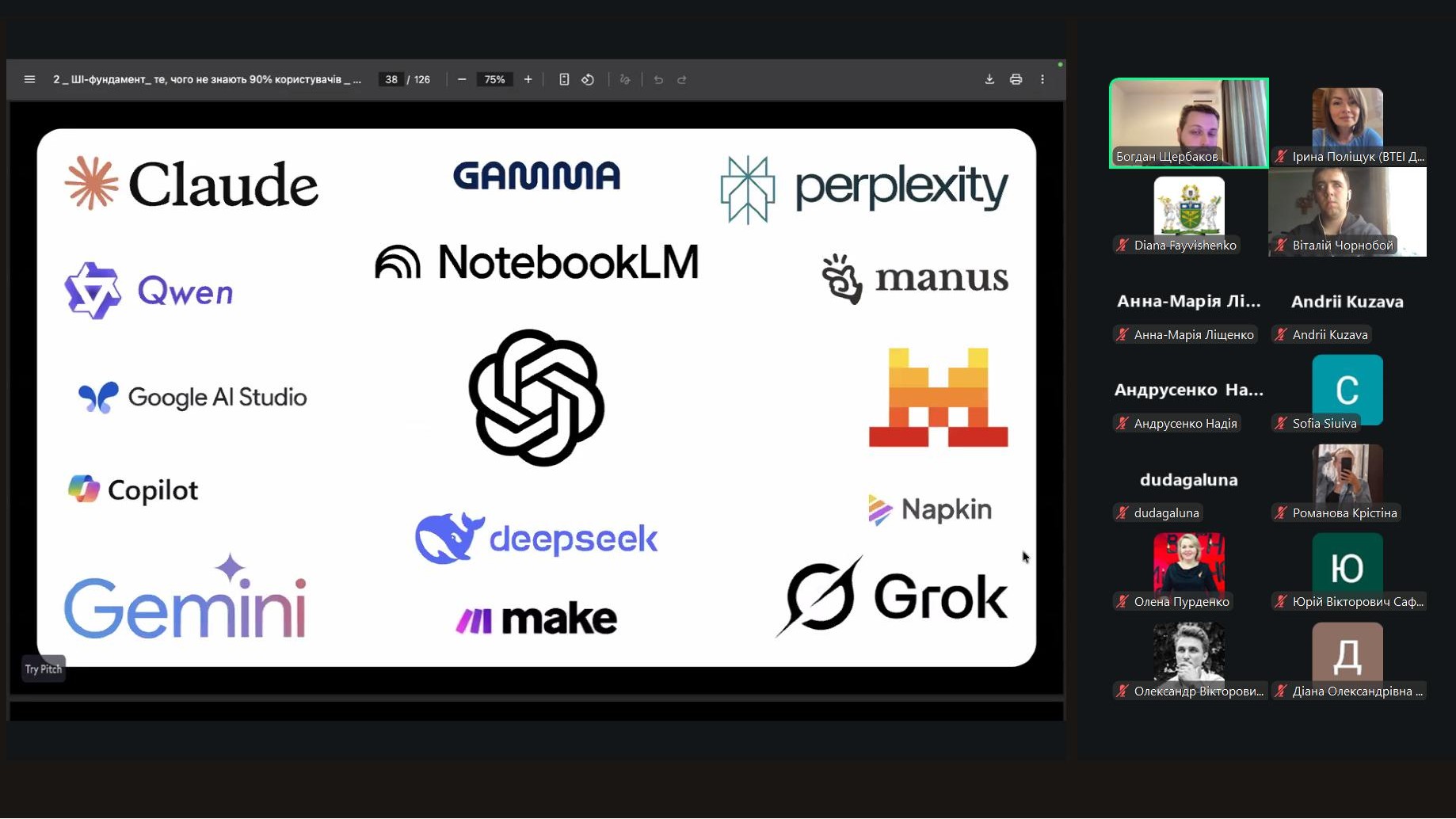 Під час лекції учасники дізналися про ключові принципи роботи ШІ та можливості його практичного застосування. Спікер пояснив, як змінюється підхід до виконання завдань «до і після» впровадження ШІ, розкрив суть поняття штучного інтелекту, токенів і контекстних вікон, а також наголосив на важливості правильного формулювання промптів. Особливу увагу приділив огляду різноманітних ШІ-асистентів, моделям і режимам роботи, а також практичним прикладам оптимізації рутинних процесів та автоматизації завдань. Окремим блоком було представлено можливості GPTs для бізнесу та освіти. Завершилася лекція жвавою сесією запитань та відповідей.