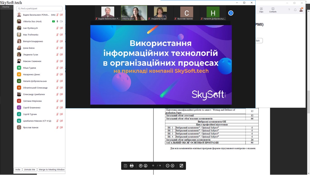 29 травня 2024 року на факультеті економіки, менеджменту та права відбувся науково-практичний вебінар «Використання інформаційних технологій в організаційних процесах на прикладі компанії SkySoft.tech» в режимі online на платформі ZOOM. Захід проводився кафедрою економічної кібернетики та інформаційних систем спільно з ТОВ «ІТ-СЕРВІС-ВІН», м. Вінниця.