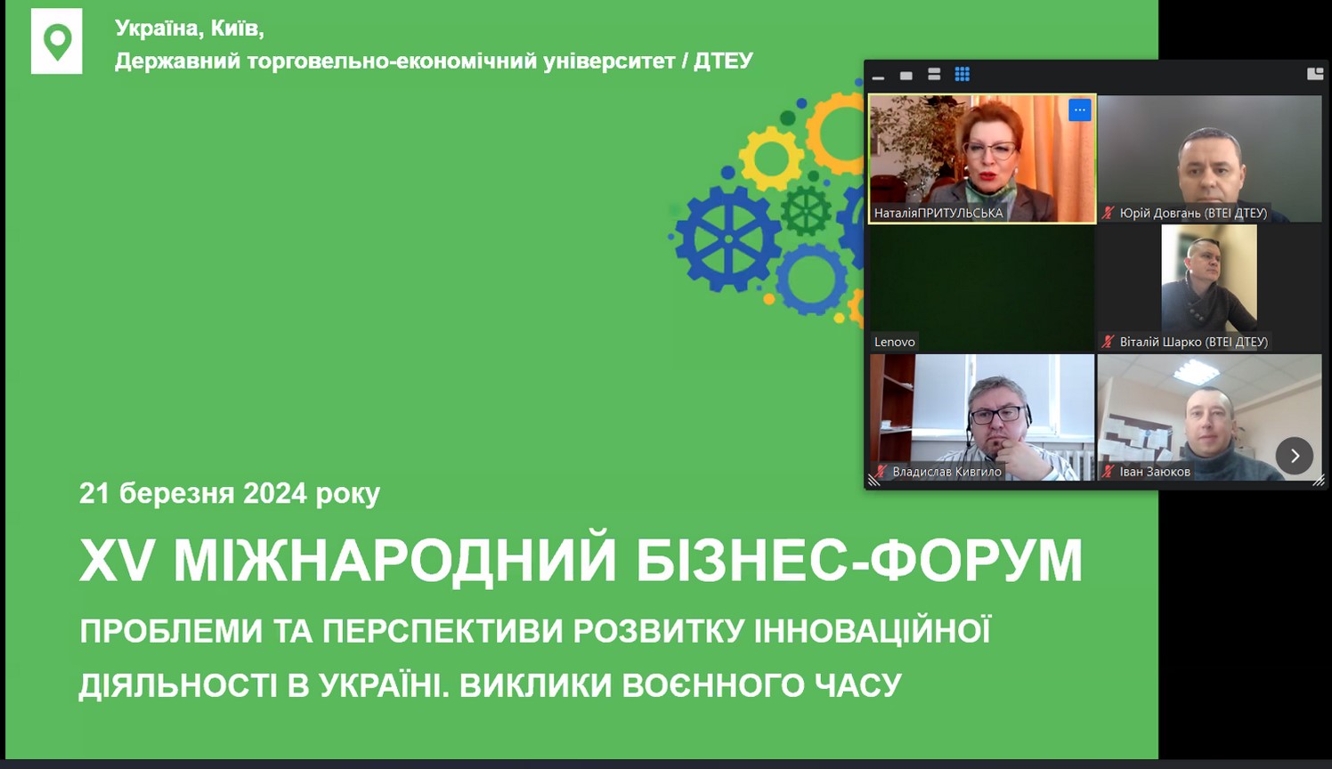 21 березня 2024 року понад 50 науково-педагогічних працівників Вінницького торговельно-економічного інституту ДТЕУ взяли участь у XV Міжнародному бізнес-форумі «Проблеми та перспективи розвитку інноваційної діяльності в Україні. Виклики воєнного часу»», який проводився на базі Державного торговельно-економічного інституту, м. Київ.