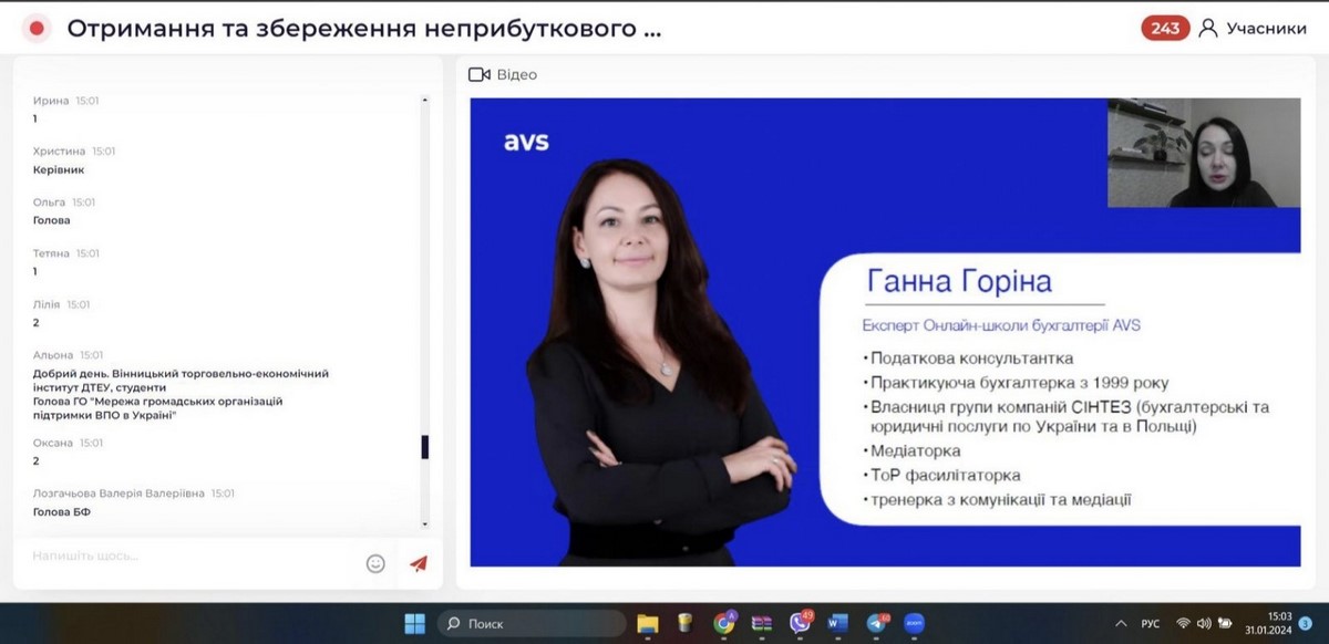 Протягом 29-31 січня 2024 року члени бізнес-школи ВТЕІ ДТЕУ, здобувачі вищої освіти та науково-педагогічні працівники брали участь у серії вебінарів «3 кроки як не втратити статус неприбутковості: річна звітність, діяльність поза статутом, співпраця з волонтерами» від AVS школи бухгалтерії.