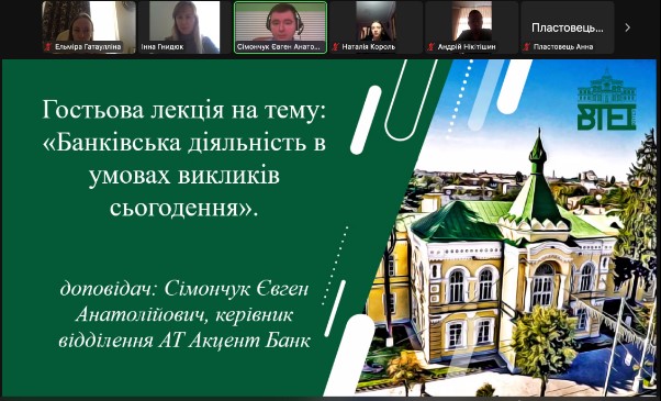 12 травня 2023 року для здобувачів ОС «молодший бакалавр», «бакалавр» та «магістр» спеціальності 072 «Фінанси, банківська справа та страхування» була проведена гостьова лекція на тему: «Банківська діяльність в умовах викликів сьогодення», спікером виступив Сімончук Євген Анатолійович, керівник відділення АТ Акцент Банк. Зустріч проходила у формі діалогу, обговорили надзвичайно важливі виклики сьогодення, розібрали наявні ризики банківської системи, торкнулися теми штучного інтелекту, та його впровадження у банківську сферу, також спікер розповів про співпрацю з іншими банківськими та небанківськими установами. Студенти жваво задавали питання, з легкістю вступали в дискусію, та з цікавістю слухати Євгена Анатолійовича.