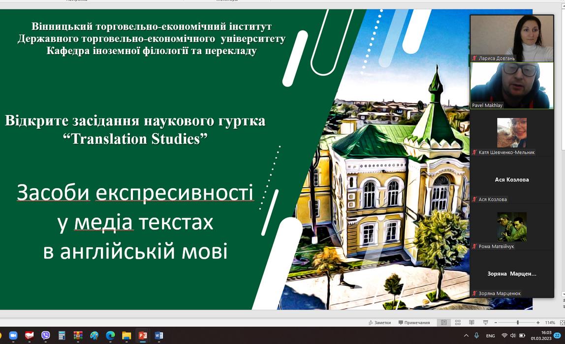 1 березня 2023 року кафедрою іноземної філології та перекладу Вінницького торговельно-економічного інституту ДТЕУ було проведено відкрите засідання наукового гуртка «Translation Studies» під керівництвом доц. Довгань Лариси на тему «Засоби експресивності у медіа текстах в англійській мові».