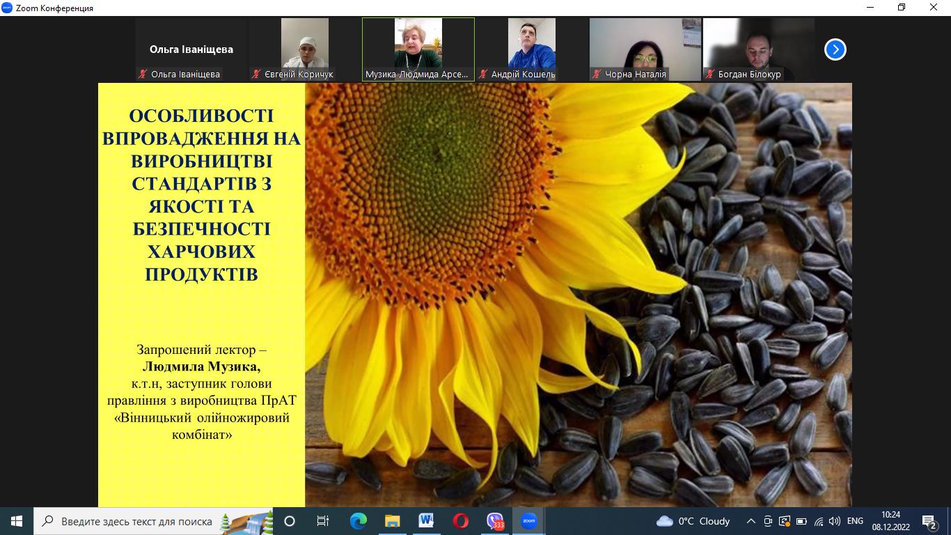 8 грудня 2022 року для здобувачів вищої освіти за спеціальністю 181 «Харчові технології» було проведено гостьову лекцію на тему «Особливості впровадження на виробництві стандартів з якості та безпечності харчових продуктів», запрошеним лектором на якій виступила Людмила Музика, к.т.н., заступник голови правління з виробництва ПрАТ «Вінницький олійножировий комбінат».
