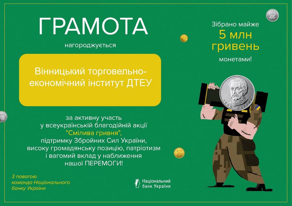 Вінницький торговельно-економічний інститут ДТЕУ долучився до Всеукраїнської акції «Смілива гривня», що була ініційована Національним банком України. Ця акція – це благодійна ініціатива, мета якої об'єднати зусилля українців та зібрати кошти для допомоги українській армії.