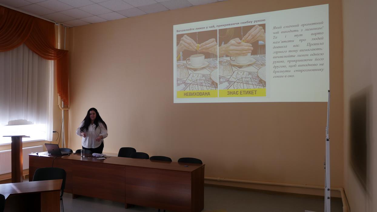 14 листопада 2022 року для школярів 10-В класу КЗ «Вінницький ліцей 4 ім. Д.І. Менделєєва» в рамках вивчення курсу «Соціальне шкільне підприємництво», доцент кафедри туризму та готельно-ресторанної справи Валентина Постова провела лекцію-презентацію «Етикет зі смаком: тонкощі столового етикету».