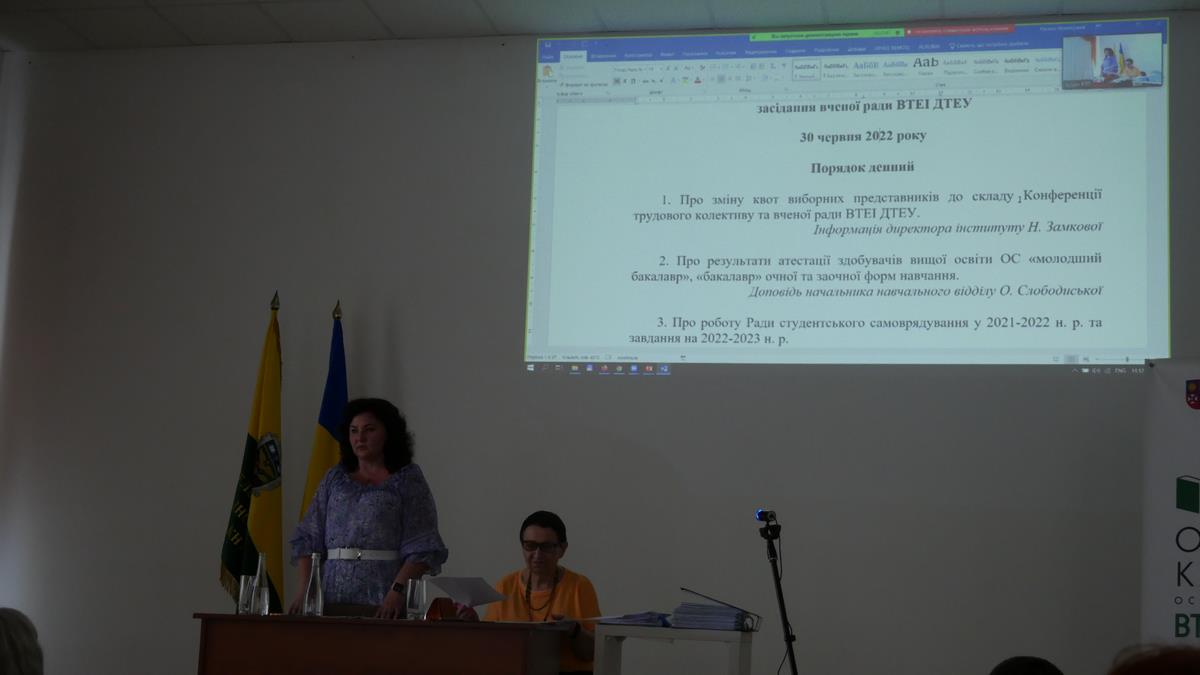 30 червня 2022 року відбулося засідання вченої ради ВТЕІ ДТЕУ, на якому були затверджені документи та ухвалені відповідні рішення згідно порядку денного.