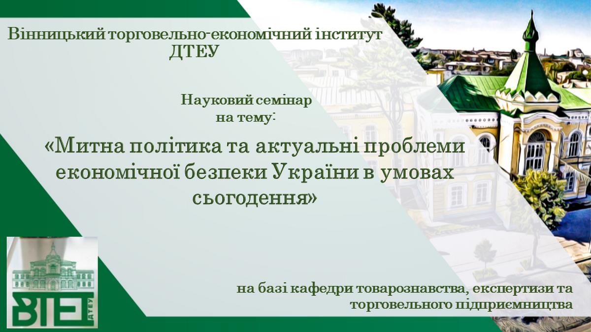 3 червня 2022 року кафедрою товарознавства, експертизи та торговельного підприємництва дистанційно онлайн на платформі Zoom було проведено науковий семінар «Митна політика та актуальні проблеми економічної безпеки України в умовах сьогодення». У семінарі взяли участь 18 осіб – здобувачі групи ТКЛ-41д та головний менеджер з розвитку торговельної мережі ТМ Steel Evolution, доцент кафедри економіки та бізнес-технологій Національного авіаційного університету Інна Григоренко.