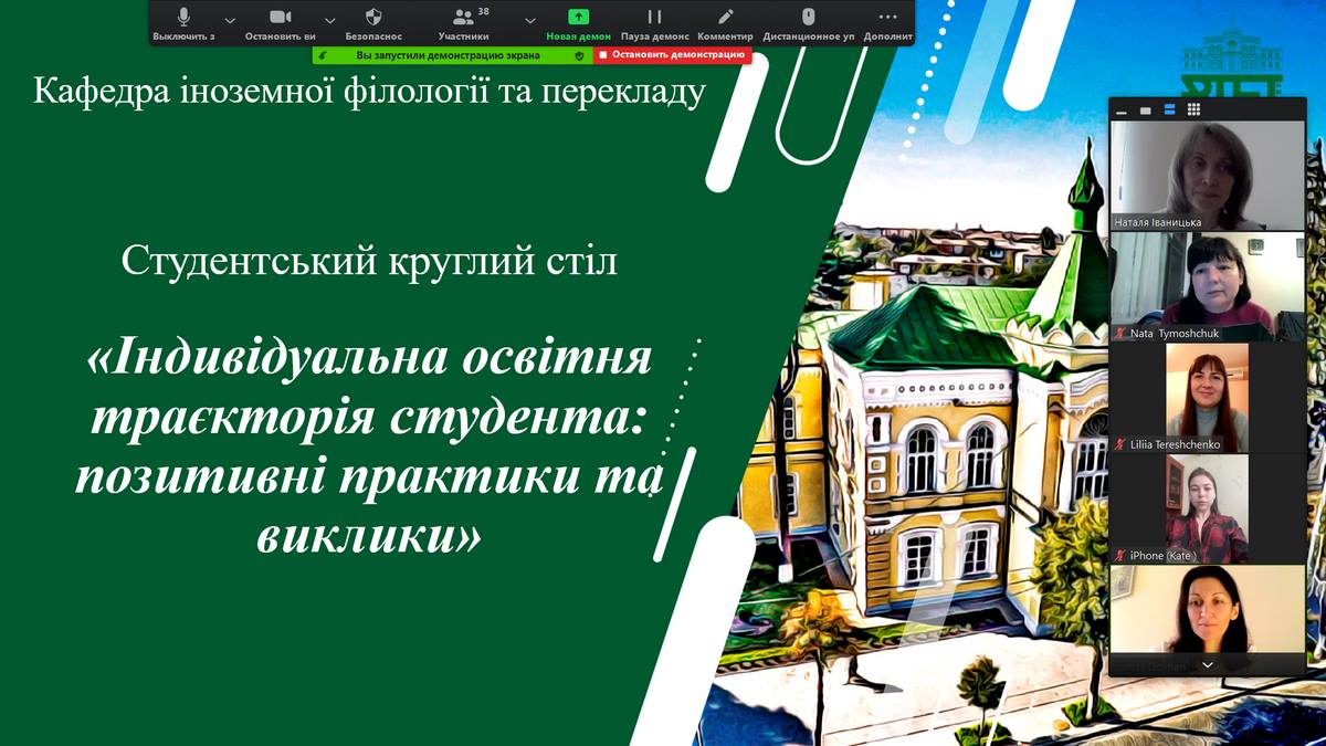 20 травня 2022 року кафедра іноземної філології та перекладу провела студентський круглий стіл «Індивідуальна освітня траєкторія студента: позитивні практики та виклики». У його роботі взяли участь студенти 1-3 курсів, які навчаються за освітньою програмою «Германські мови та літератури (переклад включно), перша – англійська». Здобувачі поділилися досвідом вибору дисциплін через автоматизовану систему SEL. Дискутували щодо задоволення професійних та особистісних потреб при формуванні індивідуальної освітньої траєкторії, порівнювали українську та закордонні практики індивідуалізації навчання. Переконалися в необхідності поглиблення фахових компетентностей через вибір спеціальних дисциплін та в створенні дружнього до студента освітнього середовища.