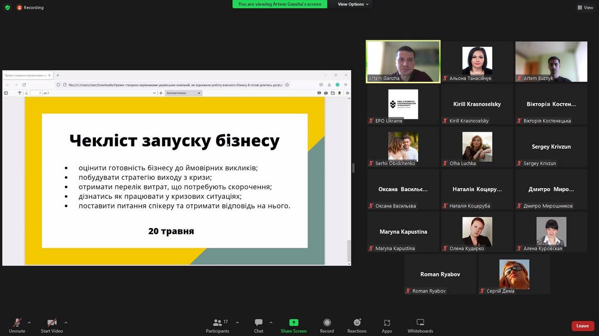20 травня 2022 року здобувачі вищої освіти та науково-педагогічні працівники брали участь у відкритому вебінарі «Чекліст для перезапуску бізнесу», який проведено за участю Офісу з розвитку підприємництва та експорту в межах проєкту Дія.Бізнес разом з командою ініціативи «UA Anti-crisis».