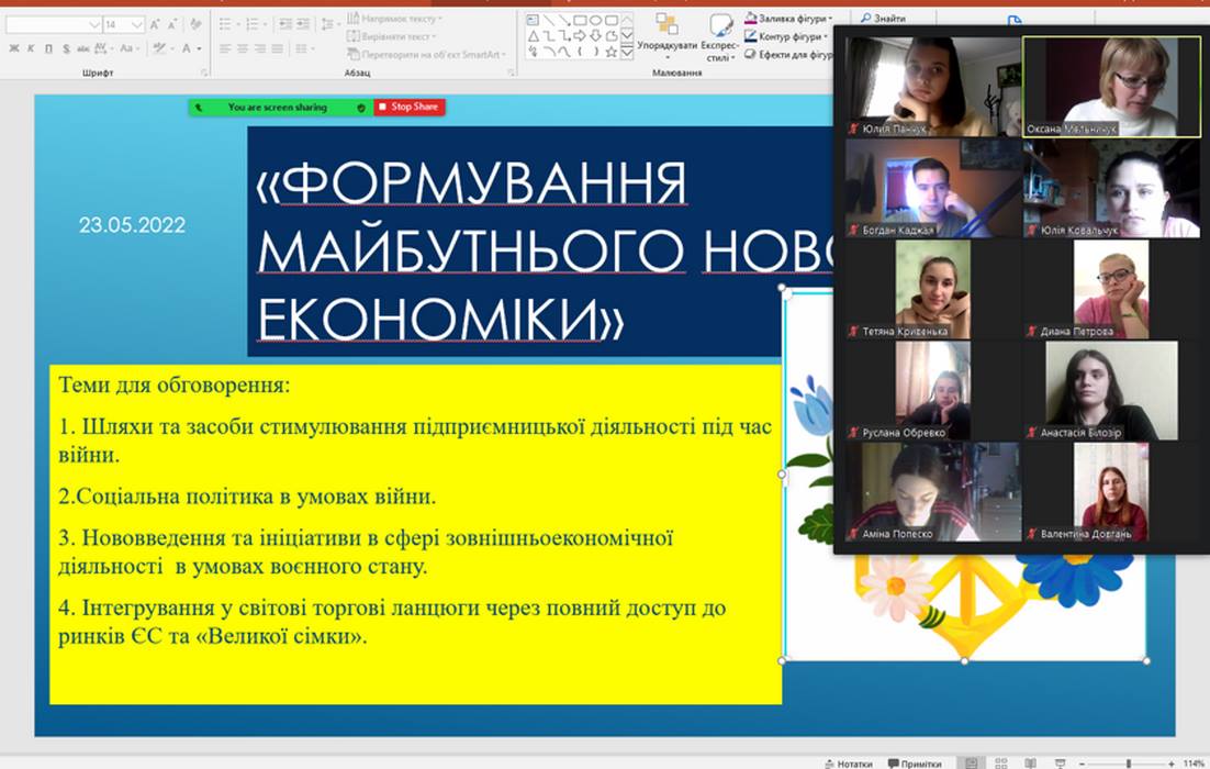 23 травня 2022 року кафедра «Економіки та міжнародних відносин» провела студентський круглий стіл «Формування майбутнього нової економіки». У його роботі взяли участь студенти 2 курсу, які навчаються за освітніми програмами «Міжнародний бізнес», «Соціальне забезпечення», «Економіка бізнесу». З метою розгляду напрямків державних та донорських програм, ініціатив підтримки підприємництва для економічного відновлення України після війни у доповідях студентів висвітлено актуальні теми сьогодення. В ході дискусії обговорено шляхи та засоби стимулювання підприємницької діяльності під час війни, соціальна політика в умовах війни. Особливу увагу приділено питанням нововведення та ініціатив у сфері зовнішньоекономічної діяльності в умовах воєнного стану, а також інтегрування у світові торгові ланцюги через повний доступ до ринків ЄС.