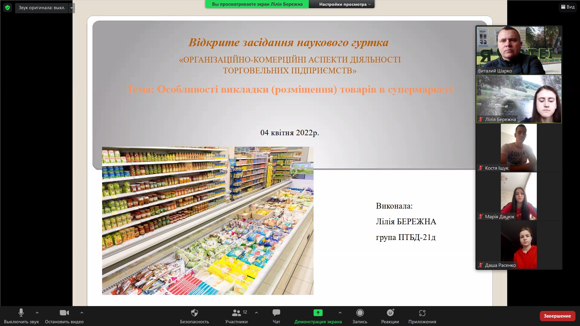 4 квітня 2022 року на кафедрі товарознавства, експертизи та торговельного підприємництва ВТЕІ ДТЕУ відбулось відкрите засідання наукового гуртка «Організаційно-комерційні аспекти діяльності торговельних підприємств». У засіданні взяли участь здобувачі вищої освіти 2-го курсу освітньої програми «Товарознавство та комерційна логістика» у кількості 13 осіб. Відкрила засідання наукового гуртка завідувач кафедри Тернова Алла, яка виступила з інформацією: «Особливості організації торгівлі в Україні під час воєнного стану».