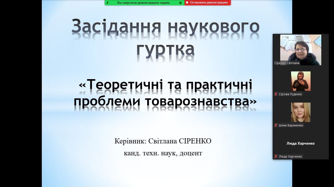 30 березня 2022 року на кафедрі товарознавства, експертизи та торговельного підприємництва відбулось відкрите засідання наукового гуртка «Теоретичні та практичні проблеми товарознавства». У засіданні взяли участь здобувачі вищої освіти 3 та 4 курсу освітньої програми «Товарознавства та комерційна логістика» у кількості 15 осіб. Відкрила засідання наукового гуртка завідувач кафедри Тернова Алла, яка виступила з інформацією: «Актуальні проблеми практичного товарознавства в Україні в період воєнного стану».