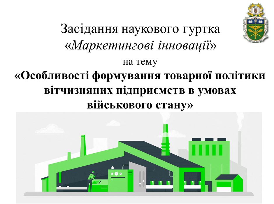 31 березня 2022 року на кафедрі маркетингу та реклами ВТЕІ ДТЕУ відбулося відкрите засідання наукового гуртка «Маркетингові інновації» на тему «Особливості формування товарної політики вітчизняних підприємств в умовах військового стану».