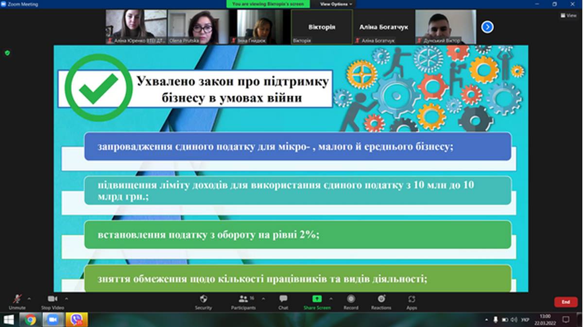 22 березня 2022 року відбулося засідання наукового гуртка кафедри фінансів ВТЕІ ДТЕУ «Актуальні проблеми модернізації фінансової системи» (керівник гуртка д.е.н., професор Олена Прутська). Студенти обліково-фінансового факультету, не зважаючи на воєнний стан, продовжують опановувати обраний фах і аналізувати виклики, з якими зіштовхнулася сьогодні економіка країни.