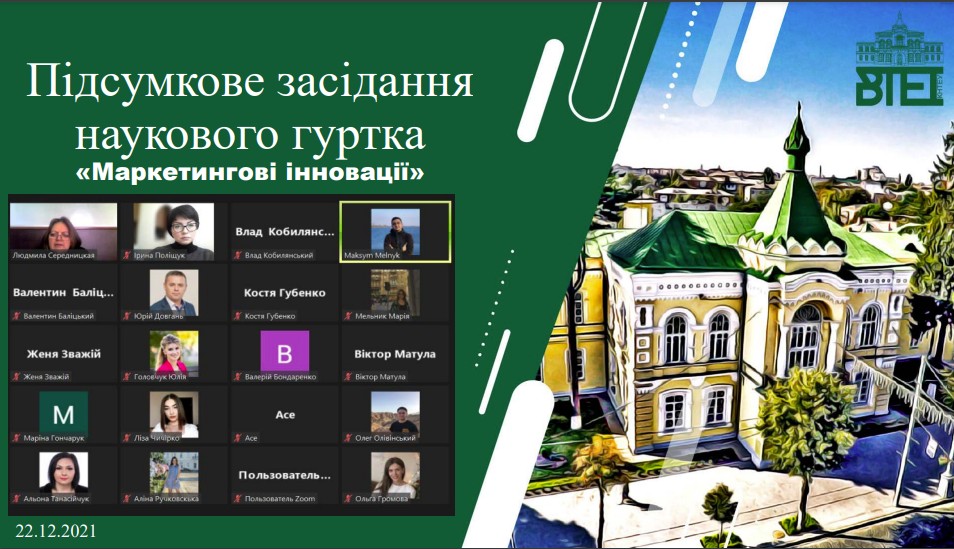 22 грудня 2021 року відбулось підсумкове засідання наукового гуртка «Маркетингові інновації», в якому прийняли участь здобувачі вищої освіти спеціальності 075 «Маркетинг» (ОП «Маркетинг, ОП «Логістика») і науково-педагогічні працівники кафедри маркетингу та реклами. Ні в кого не викликає сумніву той факт, що безперервне впровадження нововведень - єдиний спосіб підтримки високих темпів розвитку і рівня прибутковості. Під час засідання наукового гуртка здобувачі виступили із доповідями: