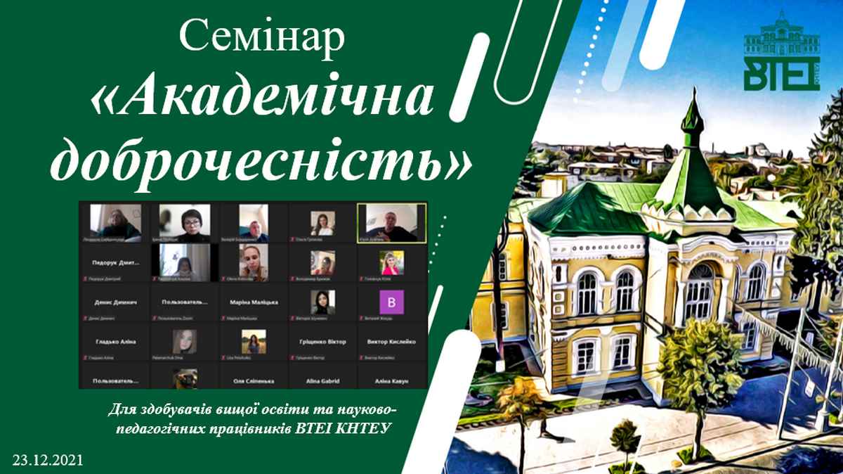 23 грудня 2021 року кафедрою маркетингу та реклами ВТЕІ КНТЕУ проведено семінар на тему «Академічна доброчесність». У семінарі прийняли участь здобувачі вищої освіти освітнього ступеня «магістр» спеціальності 075 «Маркетинг» ОП «Маркетинг».