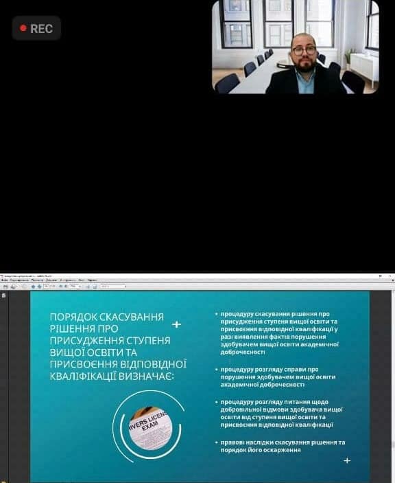 Спікер вебінару – Вадим Лавренюк, професіонал з інтелектуальної власності ДП «Український інститут інтелектуальної власності» (Укрпатент), розглянув питання формування академічної доброчесності у ЗВО, академічної доброчесності та недоброчесності, академічної відповідальності, дотримання принципів академічної доброчесності науково-педагогічним персоналом та здобувачами вищої освіти.