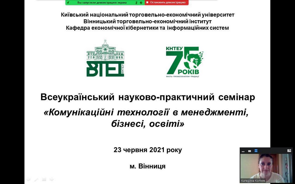 23 червня 2021 року на базі кафедри економічної кібернетики та інформаційних систем відбувся науково-практичний семінар на тему «Комунікаційні технології в менеджменті, бізнесі, освіті», який проходив у режимі online на платформі Zoom. В роботі семінару взяли участь викладачі Вінницького національного медичного університету ім. М. І. Пирогова, Державного університету інфраструктури та технологій, Вінницького торговельно-економічного інституту КНТЕУ та здобувачі освітнього ступеня «бакалавр» спеціальності «Інформаційні системи та технології» освітньої програми «Інформаційні технології у бізнесі».