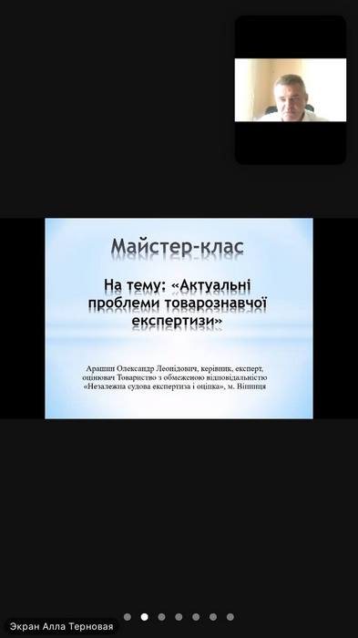 12 травня 2021 року випускник ВТЕІ КНТЕУ спеціальності «Підприємництво, торгівля та біржова діяльність» освітньої програми «Товарознавство та експертиза в митній справі» Арашин Олександр провів майстер-клас на тему «Актуальні проблеми товарознавчої експертизи» для здобувачів вищої освіти спеціальності «Підприємництво, торгівля та біржова діяльність».
