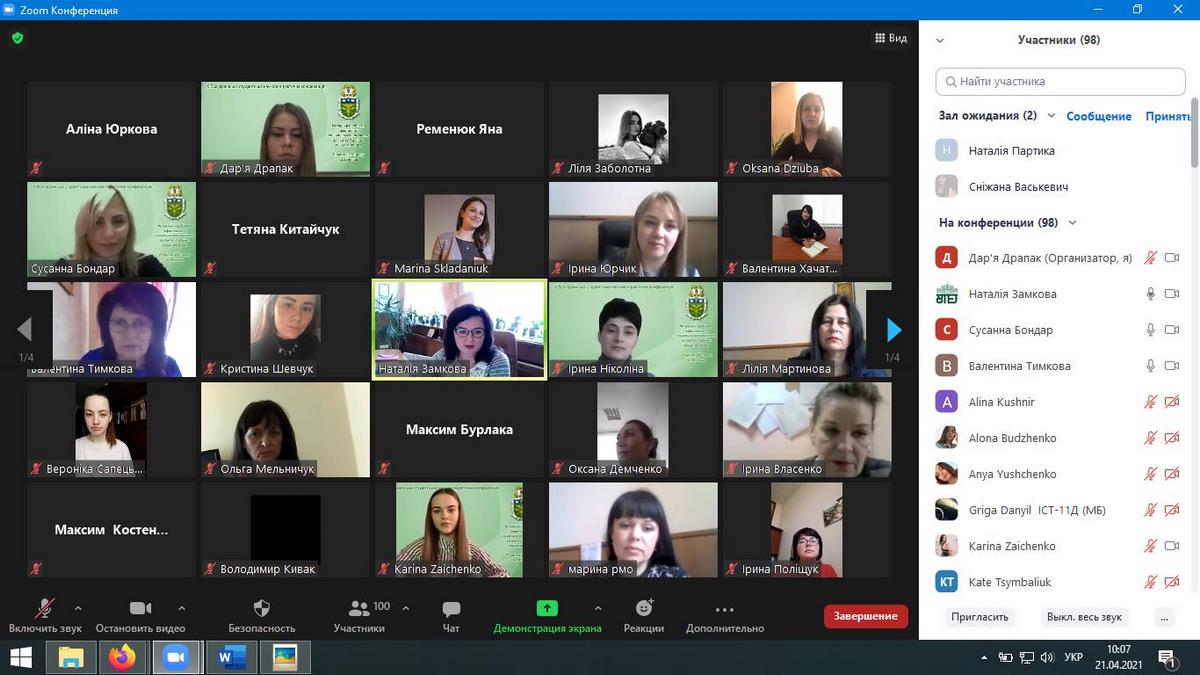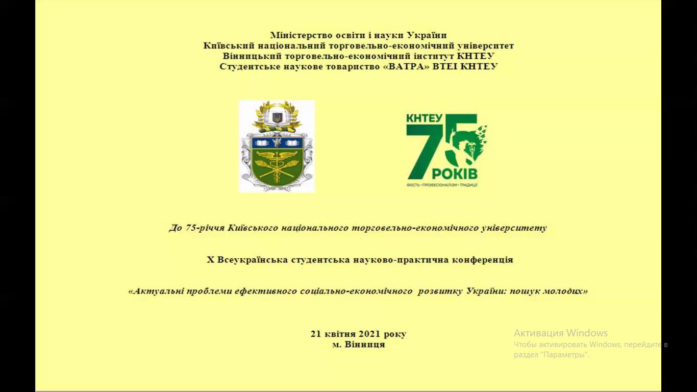 21 квітня 2021 року у Вінницькому торговельно-економічному інституті КНТЕУ відбулась X Всеукраїнська студентська науково-практична конференція «Актуальні проблеми ефективного соціально-економічного розвитку України: пошук молодих» в режимі онлайн на платформі ZOOM.