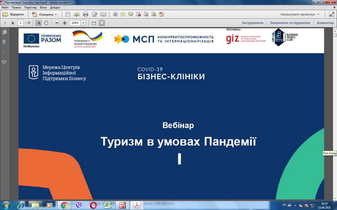 15 квітня 2021 року науково-педагогічні працівники кафедри туризму та готельно-ресторанної справи взяли участь в онлайн-вебінарі «Туризм в умовах Пандемії», організованому ГО «Business People Club». Доповідачем на заході виступив Сергій Толстіхін - експерт з розвитку туризму в громадах, веломандрівник, який відвідав 31 країну на велосипеді, креатор проєкту Green Ways - Зелені стежки України, координатор Спілки сприяння розвитку сільського зеленого туризму в Хмельницькій області, власник садиби "Дім мандрівника", проєктний менеджер Агенції сталого розвитку "Астар", комунікаційний координатор Всеукраїнської ініціативи "Активна Громада".