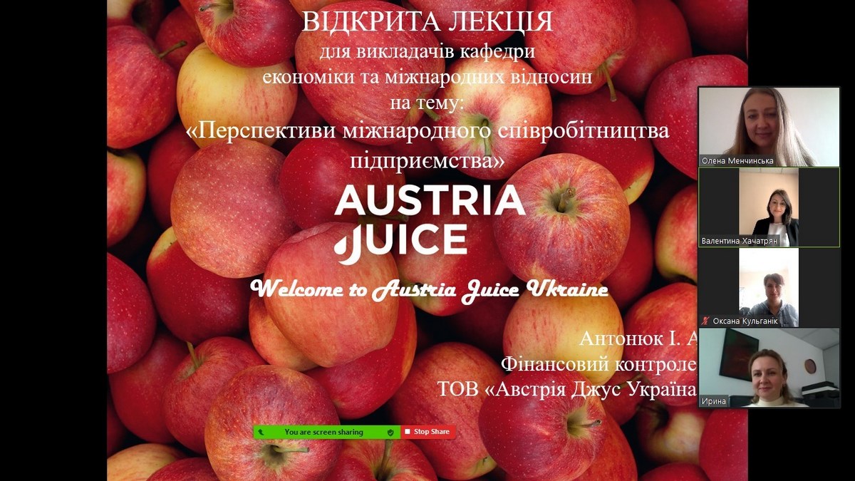 16 квітня 2021 року фінансовим консультантом ТОВ «Австрія Джус Україна» Іриною Антонюк було проведено відкриту лекцію для викладачів кафедри економіки та міжнародних відносин на тему: «Перспективи міжнародного співробітництва підприємства». Під час лекції окреслено основні проблеми, пріоритети і ключові напрямки співпраці ТОВ «Австрія Джус Україна» з іноземними партнерами, а також наголошено на проблемах, пов’язаних з подоланням наслідків пандемії COVID-19 для усієї переробної галузі промисловості.