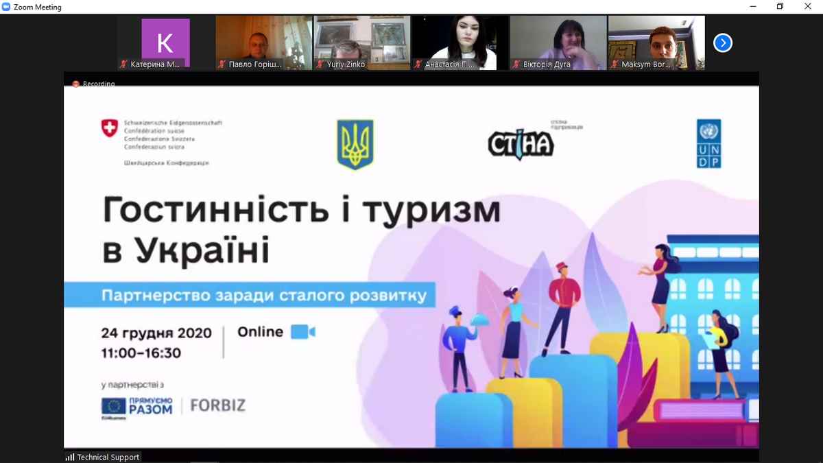 24 грудня 2020 року науково-педагогічні працівники кафедри туризму та готельно-ресторанної справи, здобувачі вищої освіти, які навчаються за спеціальностями «Туризм», «Готельно-ресторанна справа», взяли участь у першій Всеукраїнській галузевій онлайн-конференції «Гостинність і туризм в Україні. Партнерство заради сталого розвитку», організованій в рамках швейцарсько-українського проєкту «Зміцнення бізнес-об’єднань мікро-, малих і середніх підприємств (Етап 2)», що впроваджується Програмою розвитку ООН в Україні (ПРООН) у співпраці з Міністерством розвитку економіки, торгівлі та сільського господарства України і за підтримки Швейцарії.