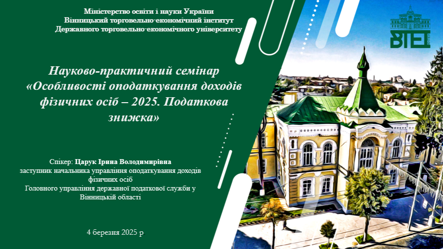 4 квітня 2025 року в рамках тижня обліково-фінансового факультету відбувся науково-практичний семінар на тему «Особливості оподаткування доходів фізичних осіб - 2025. Податкова знижка», спікером на якому виступила Ірина Царук, заступник начальника управління оподаткування фізичних осіб Головного управління Державної податкової служби у Вінницькій області.