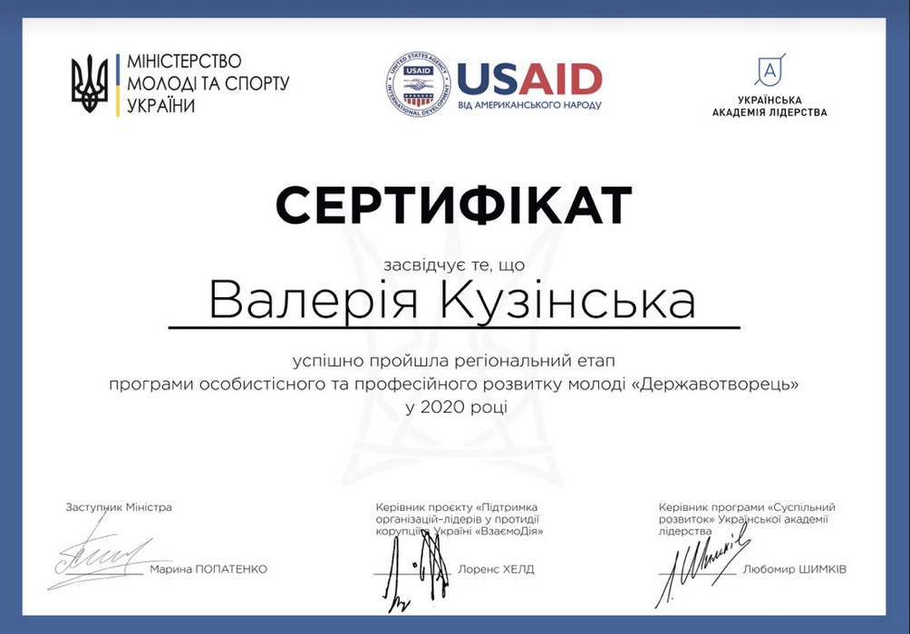 Протягом 13-30 листопада 2020 року студентка спеціальності «Публічне управління та адмініструванням» Валерія Кузінська брала участь у регіональному етапі програми особистісного та професійного розвитку молоді «Державотворець», що проводився у форматі онлайн.