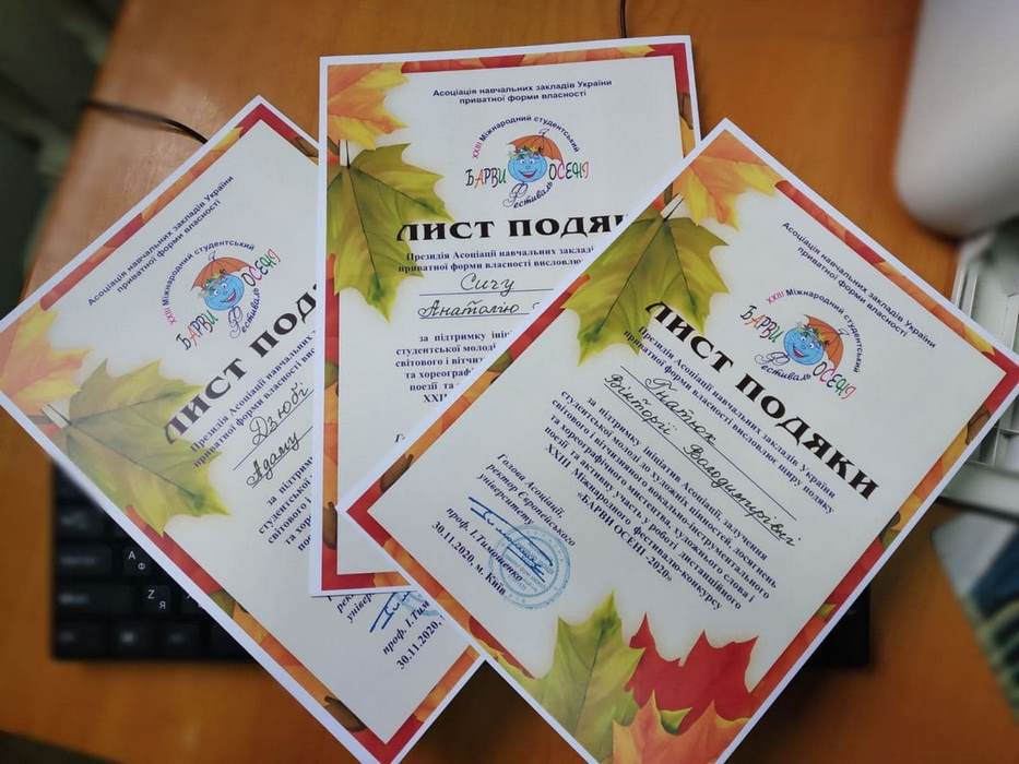 25-27, 30 листопада 2020 року з нагоди Міжнародного Дня студента, з метою активізації культурного життя студентської молоді та зміцнення творчих і дружніх зв'язків між студентами України і зарубіжжя відбувся дистанційний XХІІІ Міжнародний фестиваль-конкурс студентської художньої творчості «БАРВИ ОСЕНІ – 2020» у м. Київ. На жаль, у цьому році він проходив в незвичайних умовах карантину.