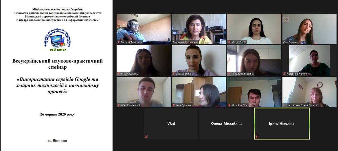 26 червня 2020 року на базі кафедри економічної кібернетики та інформаційних систем відбувся науково-практичний семінар на тему «Використання сервісів Google та хмарних технологій в навчальному процесі», який проходив в режимі on-line на платформі Zoom. В роботі семінару взяли участь викладачі Вінницького національного технічного університету, Вінницького торговельно-економічного інституту КНТЕУ та здобувачі освітнього ступеня «магістр» спеціальності «Економіка» спеціалізації «Економічна кібернетика».