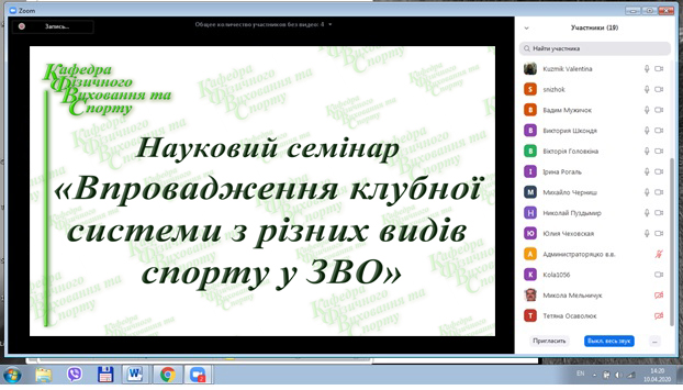 10 квітня 2020 року кафедрою фізичного виховання та спорту Вінницького торговельно-економічного інституту КНТЕУ організовано та спільно із викладачами кафедри фізичного виховання Вінницького державного педагогічного університету імені Михайла Коцюбинського на платформі Zoom дистанційно проведено науковий семінар на тему «Впровадження клубної системи з різних видів спорту у ЗВО».