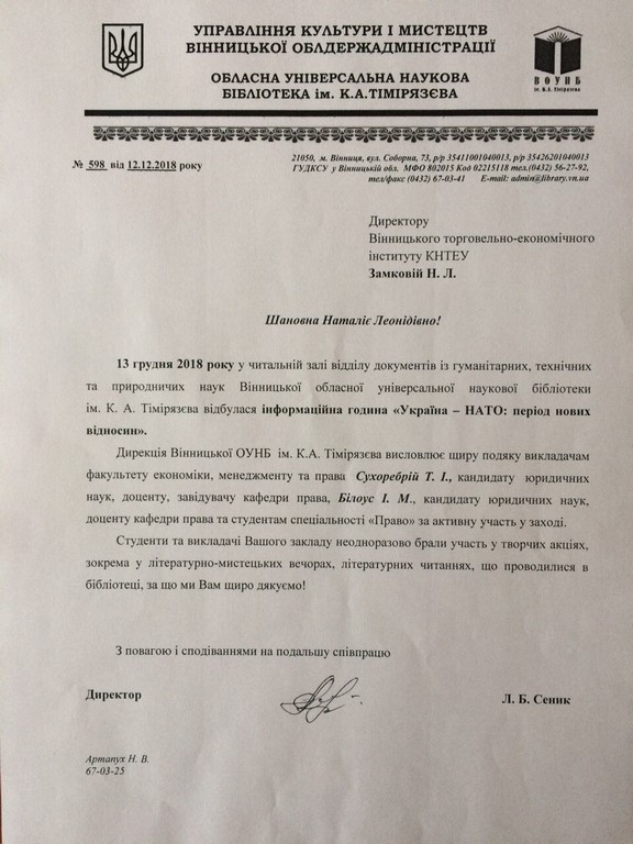 Дирекція Вінницької ОУНБ ім. К.А. Тімірязєва висловлює щиру подяку директору ВТЕІ КНТЕУ Замковій Н.Л., викладачам кафедри права та студентам інституту подяку за активну участь у творчих акціях бібліотеки.