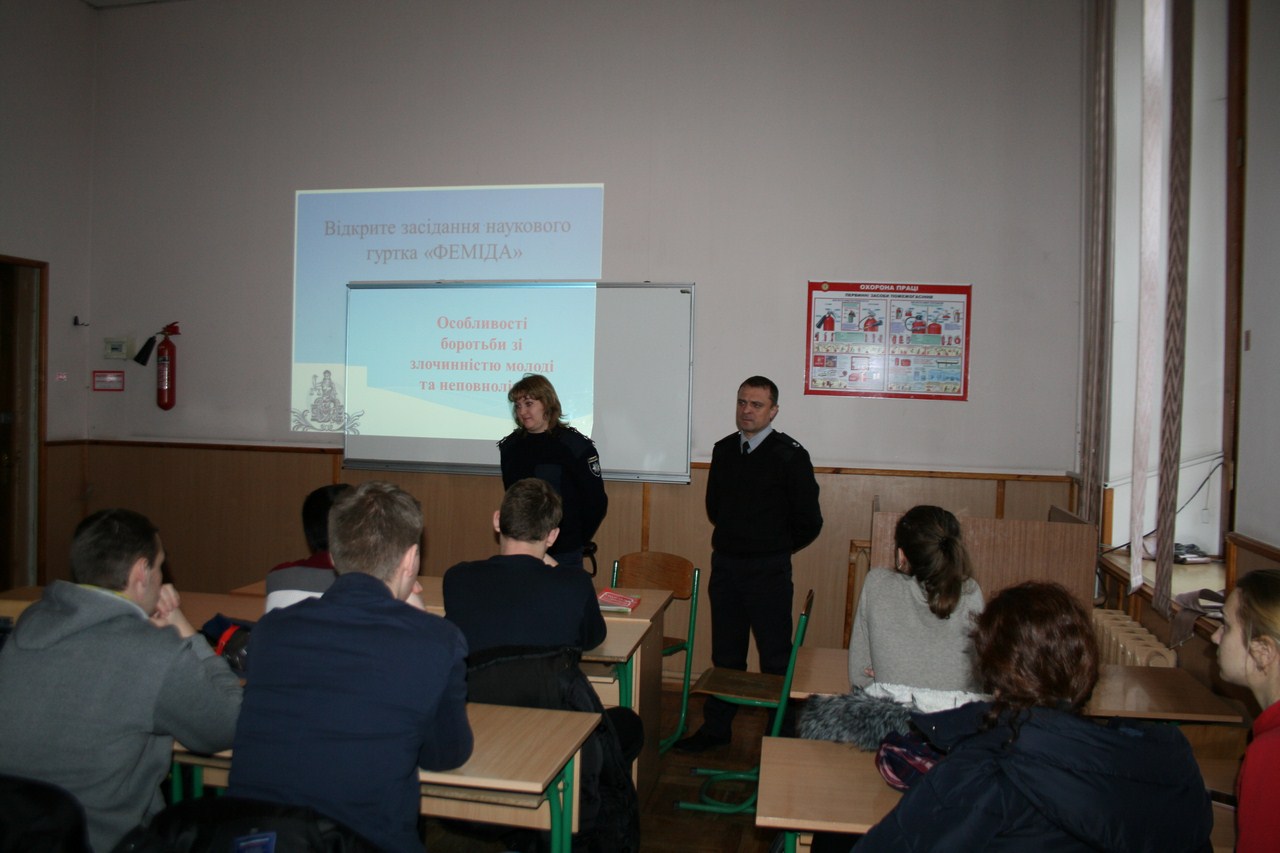 21 лютого 2017 року на факультеті економіки, менеджменту та права у рамках проведення Фестивалю студентської науки, доцентом кафедри права І.М. Білоус було проведено відкрите засідання студентського наукового гуртка «Феміда» на тему «Особливості кримінальної відповідальності та покарання неповнолітніх». Здобувачі вищої освіти груп КПР-11д,ФПР-11д, КПР-21д, ФПР-21д під час своїх доповідей визначили види покарань, які застосовуються до неповнолітніх за вчинення злочинів, підстави звільнення від відбування покарання.