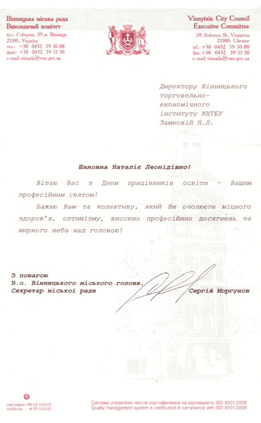 Вітання в.о. Вінницького міського голови, секретаря міської ради С.А.Моргунова з Днем працівників освіти.