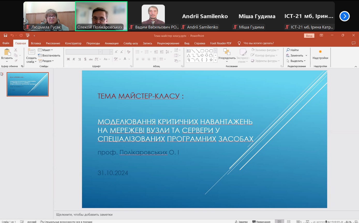 31 жовтня 2024 року кафедрою інформаційних систем та технологій ВТЕІ ДТЕУ в дистанційному форматі на платформі Zoom було проведено майстер-клас на тему: «Моделювання критичних навантажень на мережеві вузли та сервери у спеціалізованих програмних засобах», який відбувався під керівництвом Олексія Полікаровських, д.т.н., професора Одеського національного морського університету кафедри технічної кібернетики й інформаційних технологій ім. професора Р. В. Меркта.
